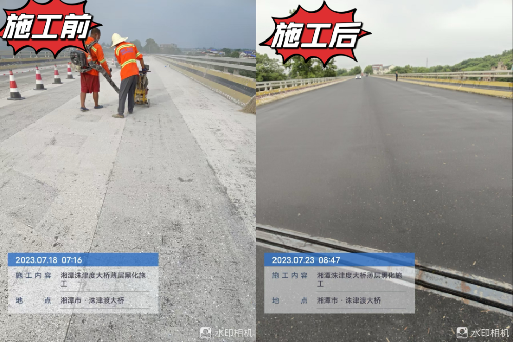 2023年湘潭洙津度大桥施工,使用我司多路面超薄磨耗层技术可延长道路使用寿命、提高防水性能、提升抗滑能力、提高耐磨、耐腐蚀能力,修复表面缺陷。